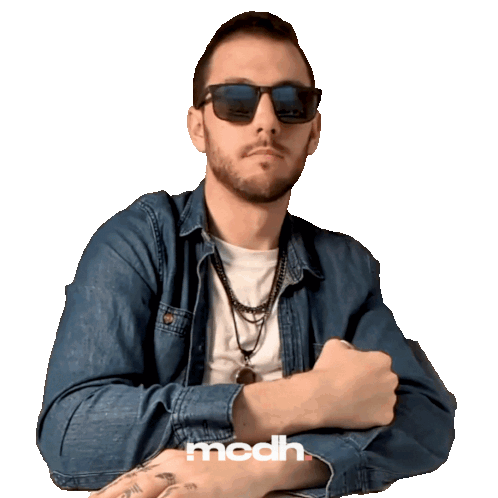 A man in sunglasses reacts with surprise, then points a credit card forward, featuring the 'mcdh' logo.