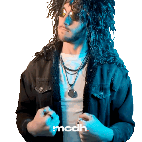 a man with long curly hair is wearing sunglasses and a black jacket with the word mcdh on the bottom