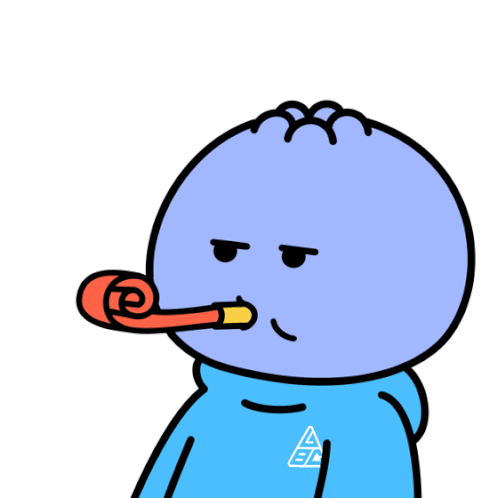 A light purple cartoon character in a blue hoodie blowing a party blower with an unimpressed, bored expression.