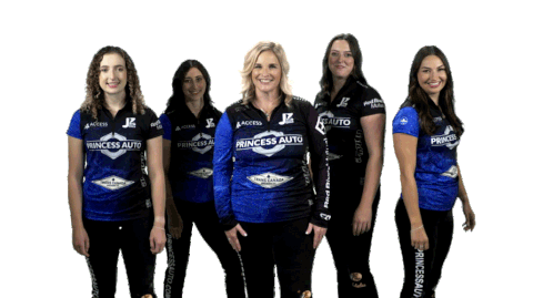 The curling team, including Jennifer Jones, Emily Zacharias, and Karlee Burgess, celebrates with a synchronized dab.