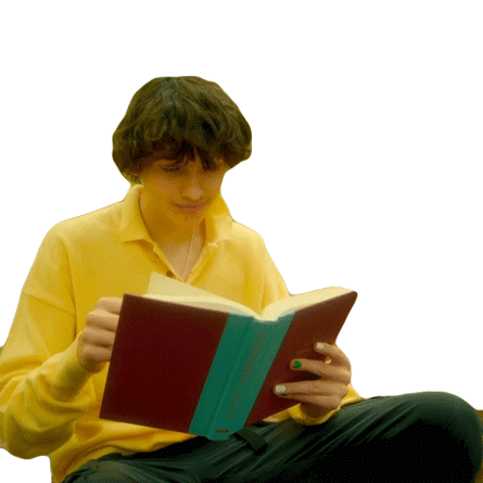 Glaive is seen intently reading a book with a red cover and teal spine, showcasing focus and a love for literature.