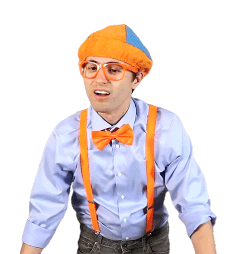 Steve Terreberry as Blippi with a quizzical expression, hands on hips, asking 'Really?' or 'Excuse me?'