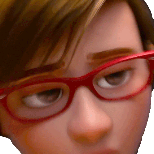 Jillian Marie Andersen's Inside Out character, Disgust, looks serious and disappointed, wearing red glasses and a dark turtleneck.