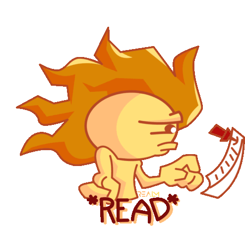 Animated sticker of a yellow character with flame-like hair, holding a sword, with 'READ' and 'REALM' text.