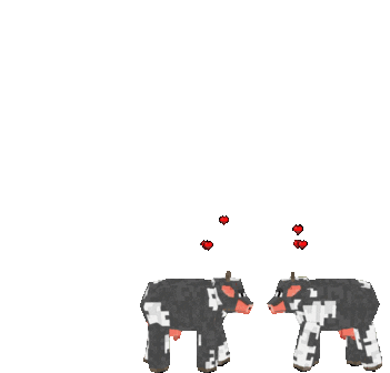 Two blocky cows from Realmcraft Minecraft stand together, emitting pink hearts, symbolizing love and affection in the game.