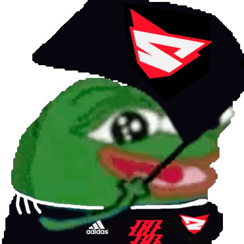 A happy Pepo Rebels frog, wearing a black cap and shirt with the Rebels Gaming logo, smiling widely.