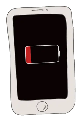 A cute, tired unicorn lies down, plugged into a charger, with a low battery icon indicating it needs to recharge its energy.