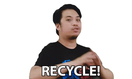 Nold enthusiastically encourages recycling, gesturing with his hands and displaying the word 'RECYCLE!' on screen.