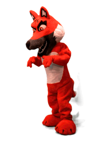 Red Canids' energetic fox mascot, Rufus, strikes a dynamic pose, ready for action and cheering on the team.