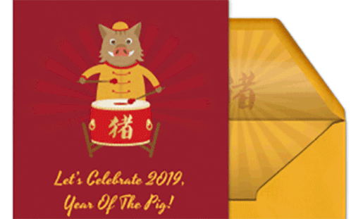 A festive Chinese New Year card for 2019, featuring a pig drummer and a red envelope, celebrating the Year of the Pig.