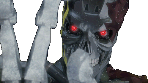 A menacing Terminator endoskeleton with glowing red eyes and a skeletal hand reaching out from the 'Terminator Zero' series.