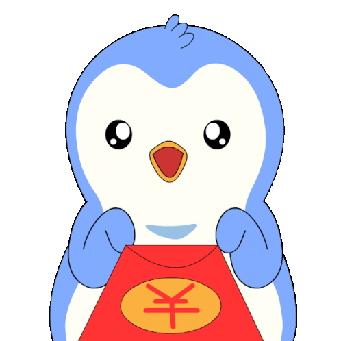 a blue and white penguin is holding a red bag with a chinese symbol on it