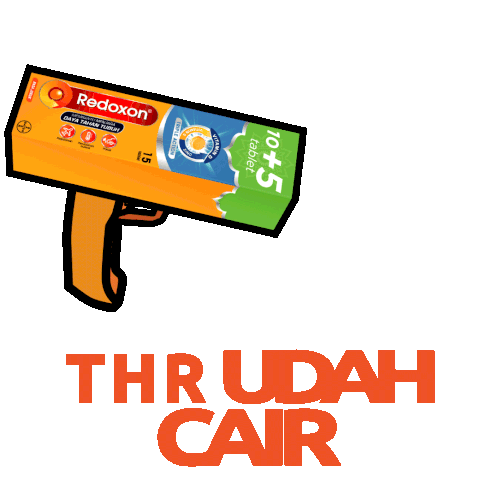 An animated Redoxon box shoots out money, celebrating "THR Udah Cair" (Holiday Allowance disbursed) for Ramadan.