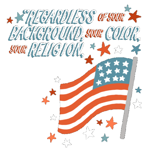 An animated sticker featuring a quote from Joe Biden about inclusivity, accompanied by a waving American flag and stars.