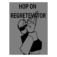 A black and white animated sticker featuring the 'HOP ON REGRETEVATOR' text and a Roblox character.