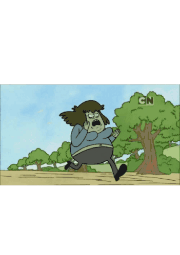 Muscle Man from Regular Show runs with a determined expression across a cartoon landscape.