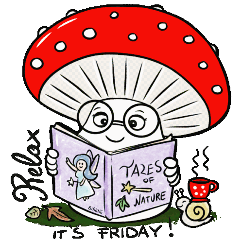 A cute mushroom with glasses relaxes by reading a book titled 'Tales of Nature' with a snail and a hot drink, celebrating Friday.