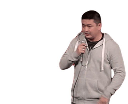 Andre Santi makes a 'stop' gesture with his hand, holding a microphone, conveying a sense of 'wait' or 'relax'.