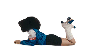 Jenevieve is seen relaxing on her stomach, wearing a blue jacket and distinctive claw-like slippers, in a moment of calm.