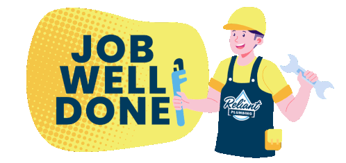 A cartoon plumber from Reliant Plumbing celebrates a successful repair, holding wrenches with a 'Job Well Done' message.