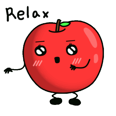 A cute red apple character with a relieved expression spreads its arms, accompanied by the caption 'Relax', conveying calm.
