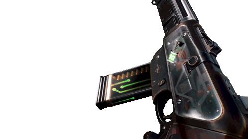 A futuristic Phantom gun from Valorant, associated with Cypher, reloads with a distinctive green glow.