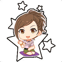 Chibi Rena Hyodo kneels on a mat, holding a sparkling object, surrounded by stars in this cute animated sticker.