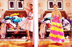 Renée Slater trying on dresses in a messy room