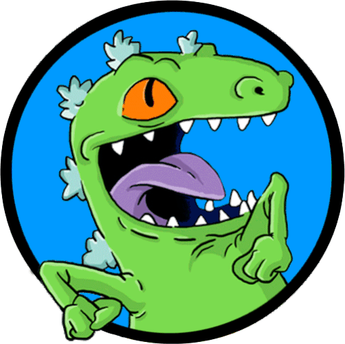Reptar, the green dinosaur from Rugrats, roars with a wide-open mouth and purple tongue, looking wild and energetic.