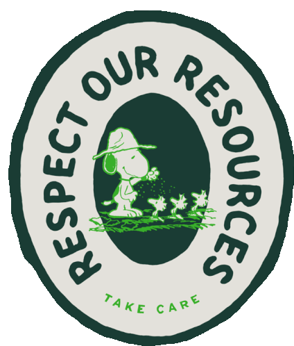 Snoopy promotes environmental care with a 'Respect Our Resources, Take Care' message, sprinkling seeds.