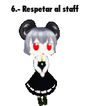 A cartoon character with ram horns and red eyes illustrates the rule 'Respetar al staff' (Respect the staff).