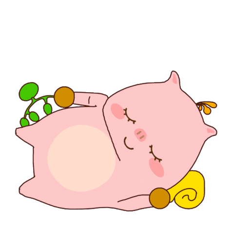A cute pink cartoon pig lies on its side, eyes closed, holding a small green plant, appearing peaceful and relaxed.