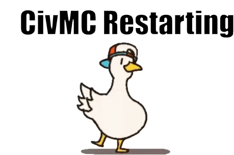 A cute animated duck wearing a baseball cap dances with the text 'CivMC Restarting' displayed above it.
