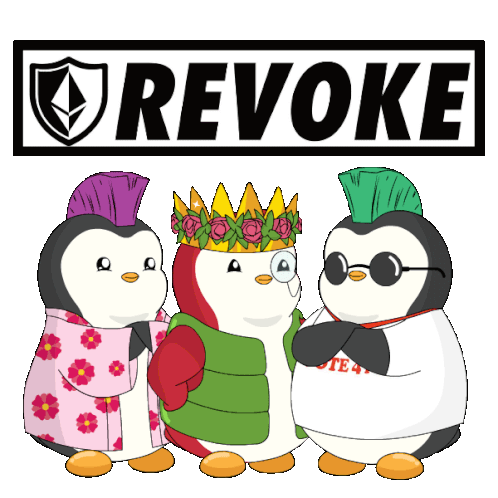 Three Pudgy Penguins stand guard in front of a 'REVOKE' sign, symbolizing secure token approvals in crypto.