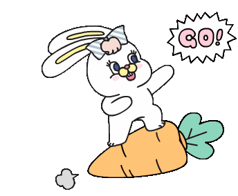 Rico Rabbit, a cute bunny, rides a giant carrot, ready for action and exclaiming "GO!".