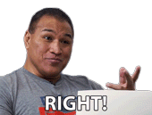 A man in a grey shirt holds up a white sign with 'RIGHT!' written on it, smiling and laughing enthusiastically.