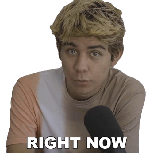 A young man with light hair looks intently at the camera, speaking into a microphone with the text 'RIGHT NOW' displayed below him.