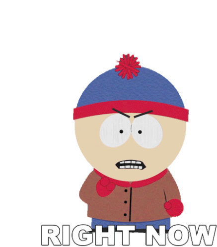 Stan Marsh from South Park, looking angry and demanding, with the text 'RIGHT NOW' emphasizing urgency.