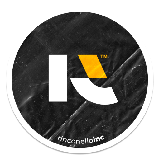 A circular sticker featuring the Rinconello Inc logo in white and yellow on a textured black background, perfect for branding.