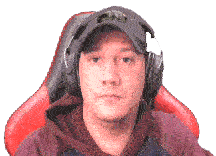 Man in a gaming chair with headphones and a cap, laughing joyfully with eyes closed.