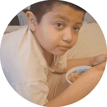 Castillitos, the little girl with a ponytail, smiles and covers her mouth, full of laughter and shyness.
