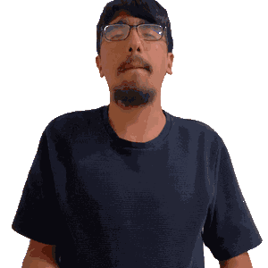 a man wearing glasses and a black shirt is making a gesture with his hands