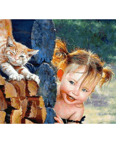A charming painting depicts a young girl with pigtails peeking playfully from behind a woodpile, alongside a curious ginger kitten.