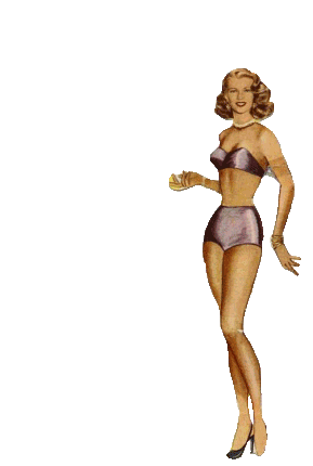 Rita Heighworth, the iconic star, posing elegantly in a stylish two-piece swimsuit and high heels.