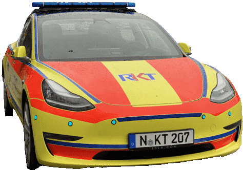An animated sticker of a German RKT Tesla Model 3 emergency vehicle with flashing blue lights.