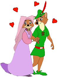 Robin Hood and Maid Marian, the beloved fox characters, share a tender moment, holding hands with hearts floating around them.