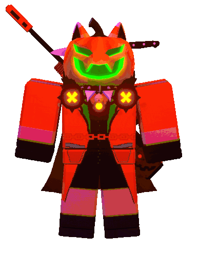 An animated Roblox avatar, a vibrant orange and black fox-like character with glowing green eyes, spinning dynamically.