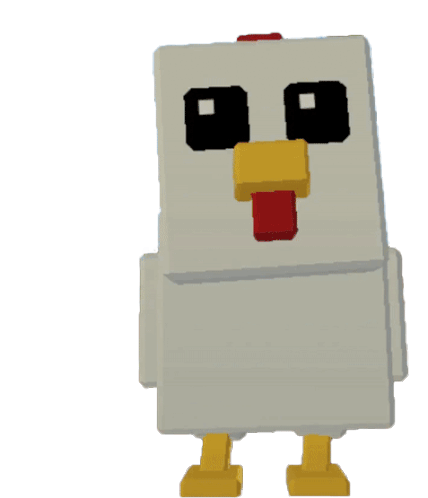 A blocky, pixelated white chicken character with a yellow beak and red comb, from Roblox Islands, stands tilted.