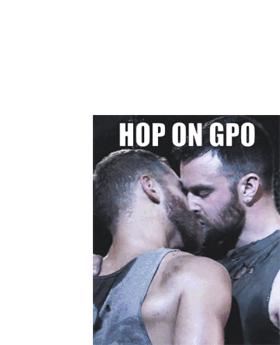 Two men kissing with 'HOP ON GPO' text, referencing a Roblox meme. A gay sticker.