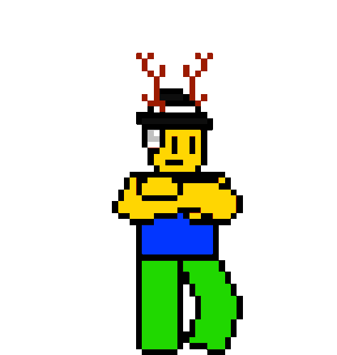 A pixel art Roblox Noob character, wearing a hat with antlers, takes off and throws its hat in a happy, animated gesture.